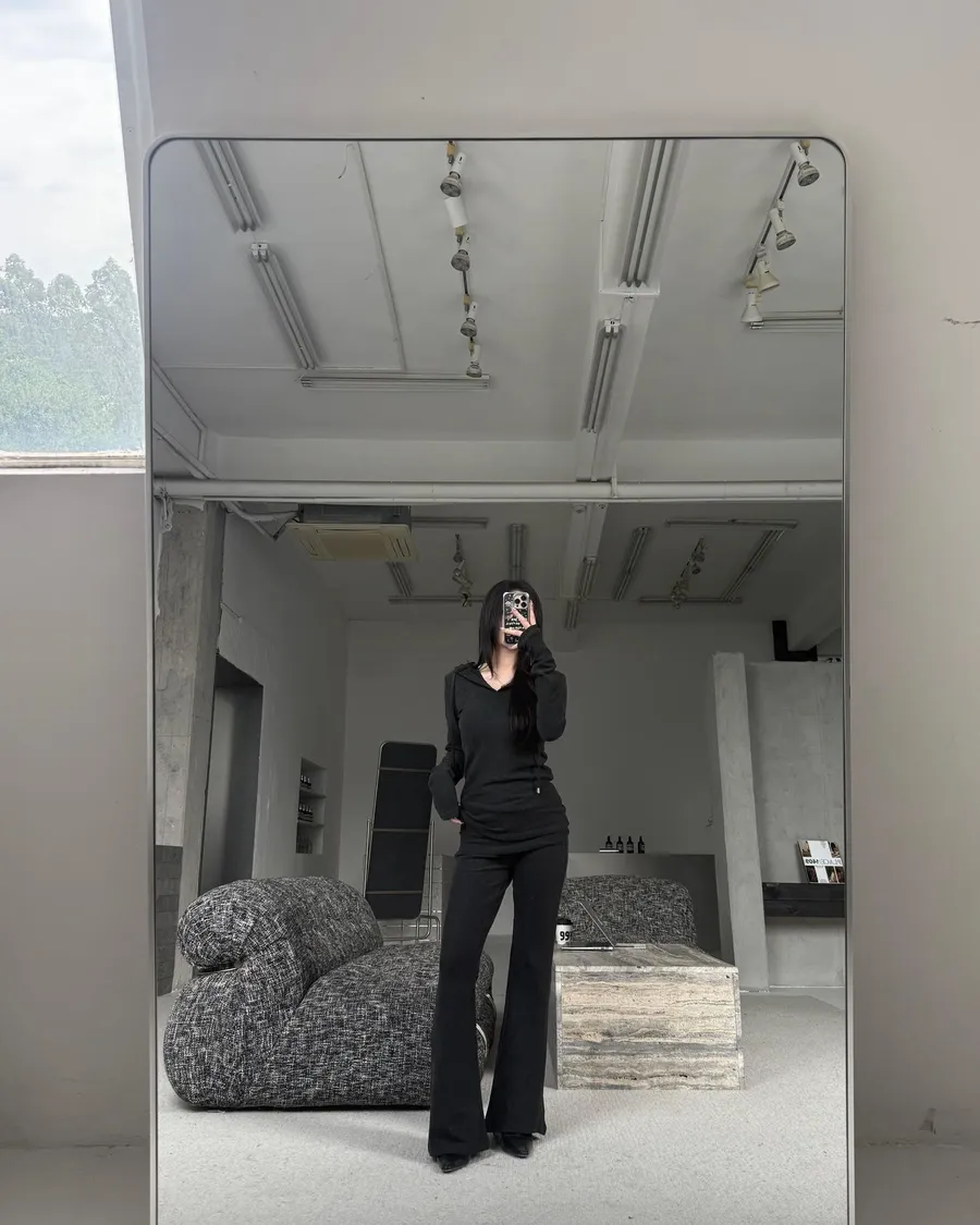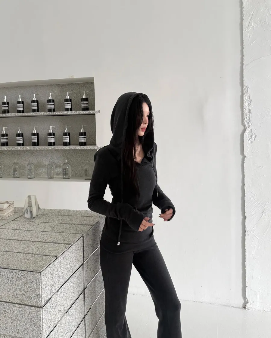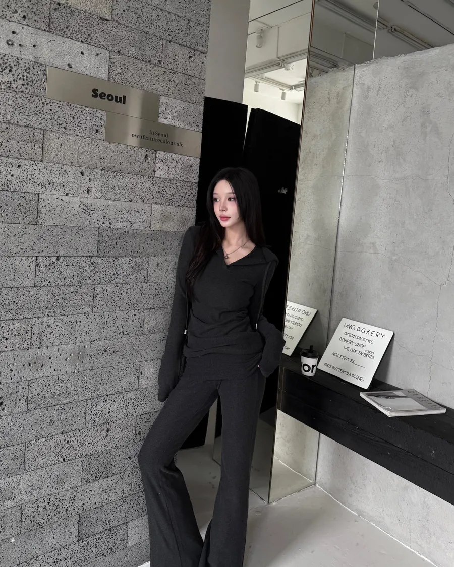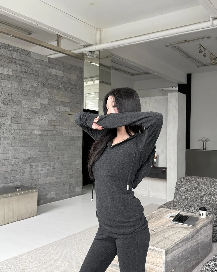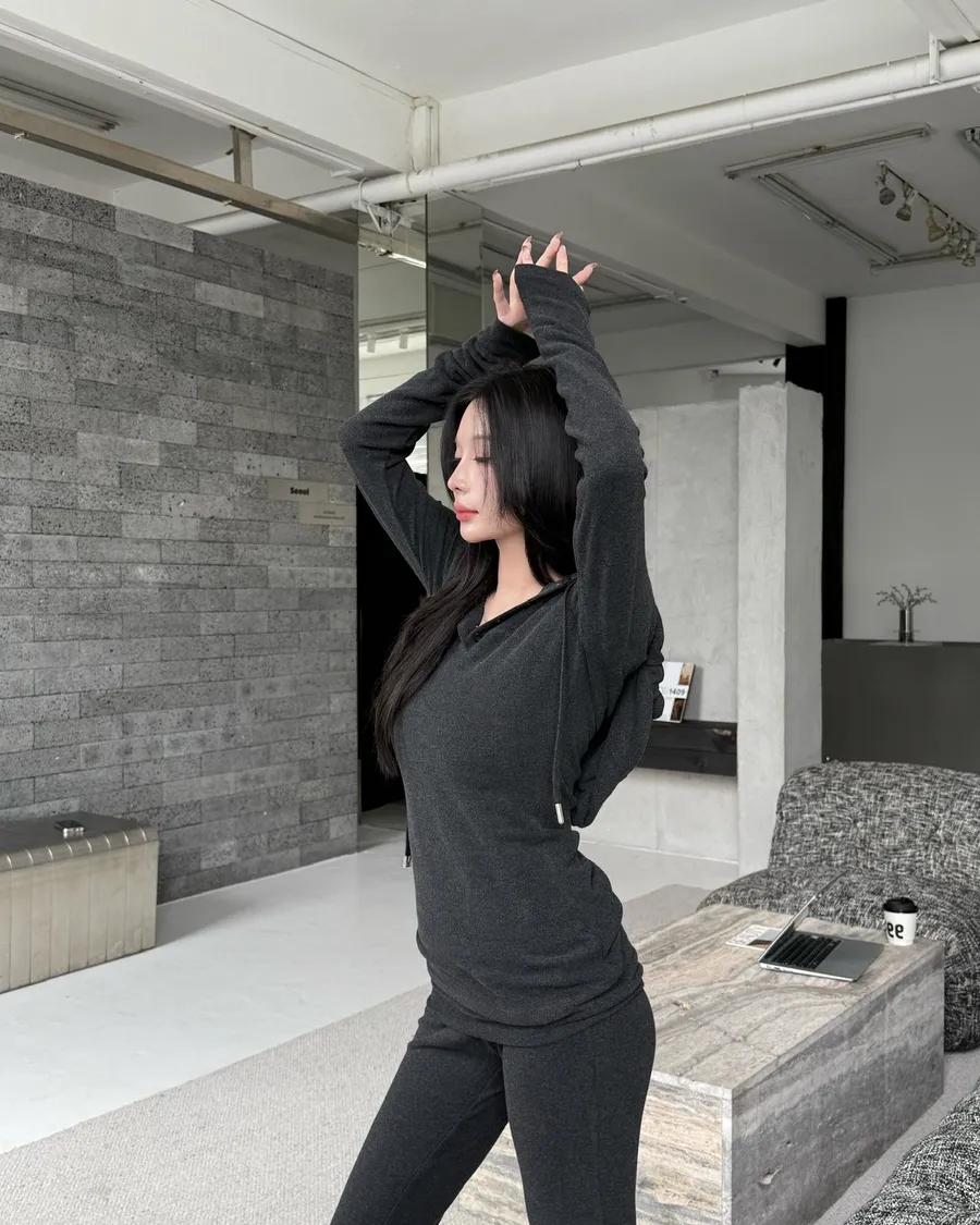 嬰兒絨材質細緻柔軟,觸感親膚溫暖。整套設計簡單乾淨,卻不顯單調,穿起來有自然的高級感。適合居家、外出或旅行時穿著,是一套能讓人感到安心與放鬆的舒適套裝。