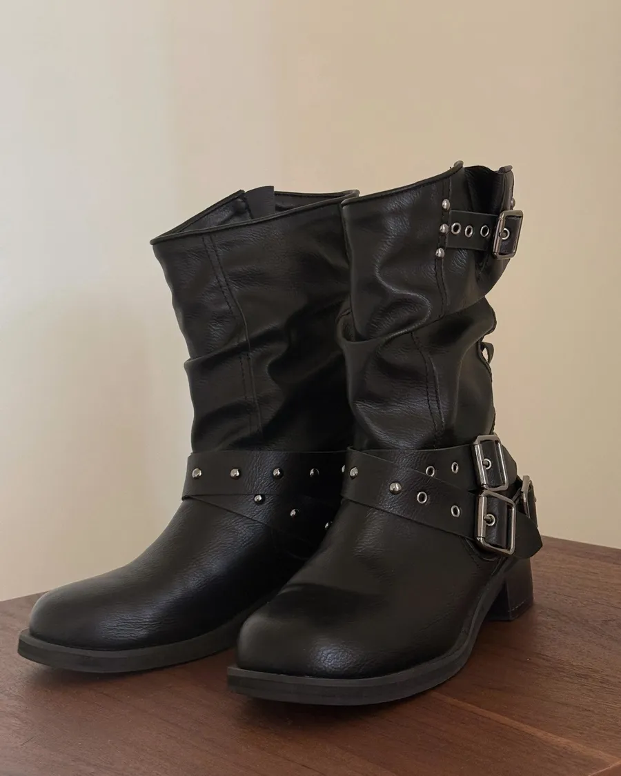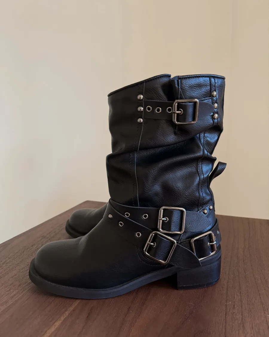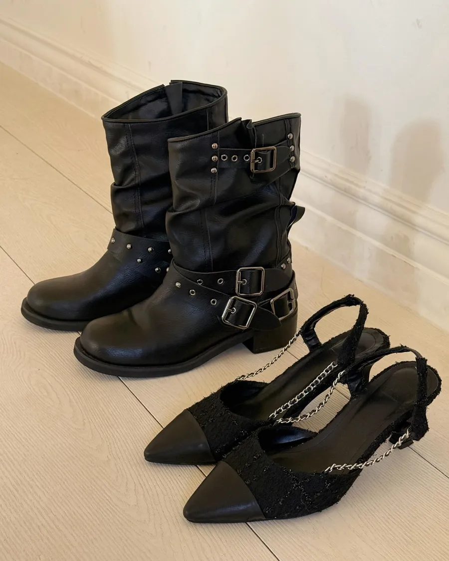 率性黑色調搭配卯丁與扣環設計,整體風格鮮明卻不浮誇。短靴版型俐落修飾腳踝線條,穿起來顯瘦又有態度。中低跟高度讓行走更加穩定,日常穿搭也非常實穿。搭配洋裝能中和甜感,配牛仔或皮裙則能加強個性氛圍,是一雙能輕鬆切換風格、穿出自我態度的黑色短靴。